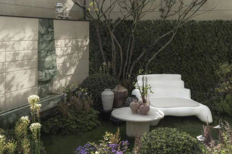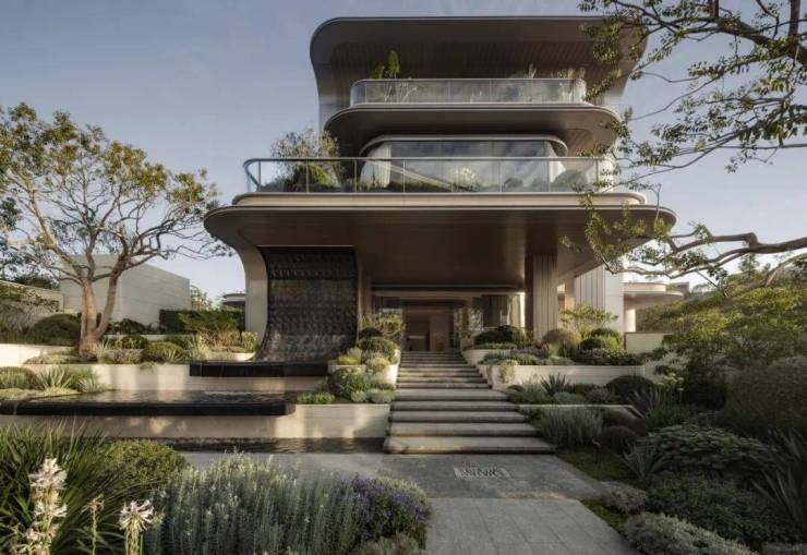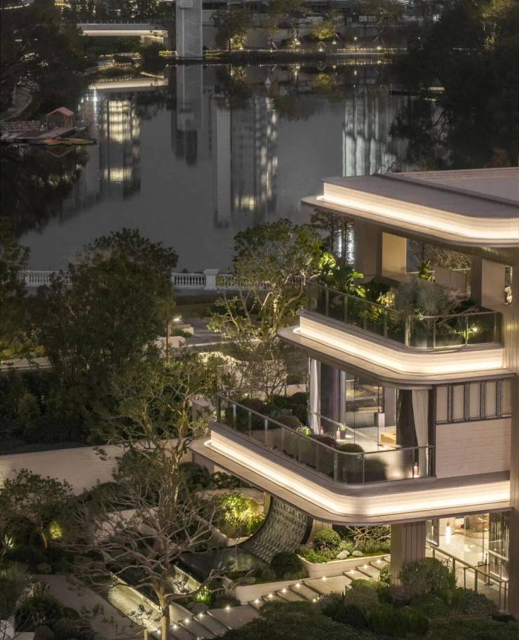 水脉相承,以之为礼。两侧叠瀑水景包裹于精致花境中,悄然划定私属疆界;原生大树与灵动水景交错相融,与自然过渡。