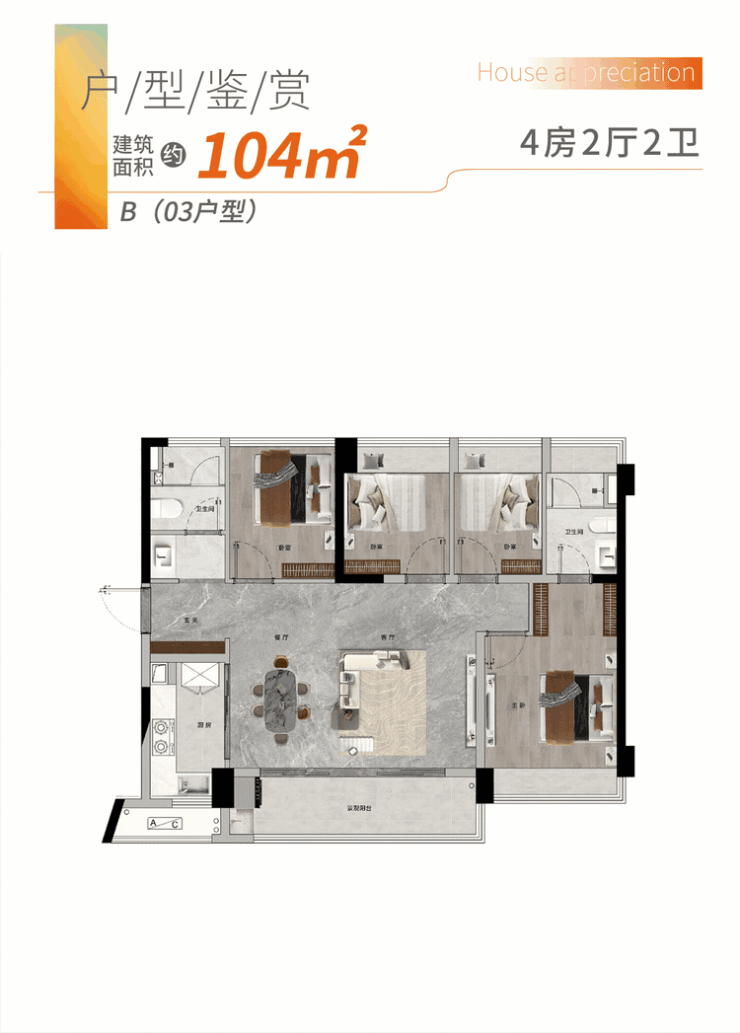 建面约104平方米四房,公区零过道,能最大化利用面积;四个卧室都能放下双人床,不用再委屈哪个家人,简直是二胎家庭的白月光。