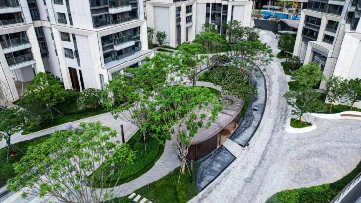 来到现场,已经能看到一个实景园林,多层次绿植和蜿蜒道路相映成趣,还有人性化遮荫景观廊架,将“凤羽溪谷”的设计灵感照进现实。