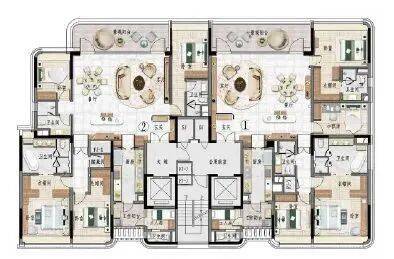 建面约239㎡的户型拥有一个宽度为8米的阳台,而建面约242㎡的户型则拥有一个宽度为8.4米的阳台。这两个户型的实用率为83.6%。