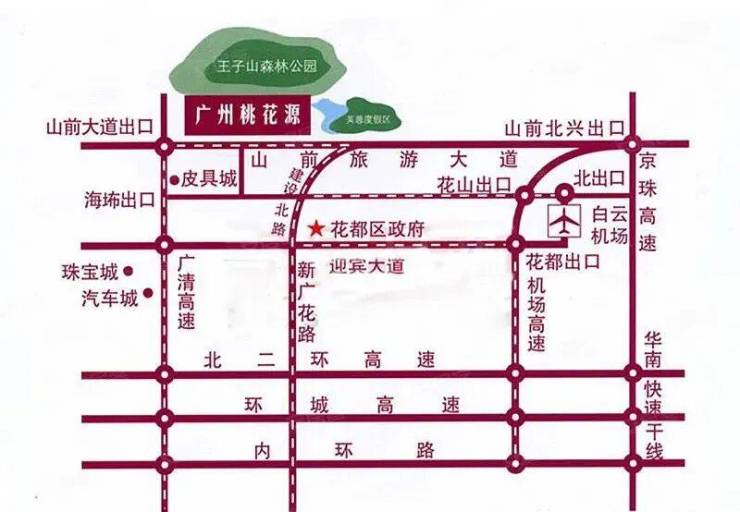 桃花源小区南距山前旅游大道约400米,西接广清高速山前大道出口;离花都中心城区约10公里,距广州新白云机场约15公里,距广州中心城区约30公里。
