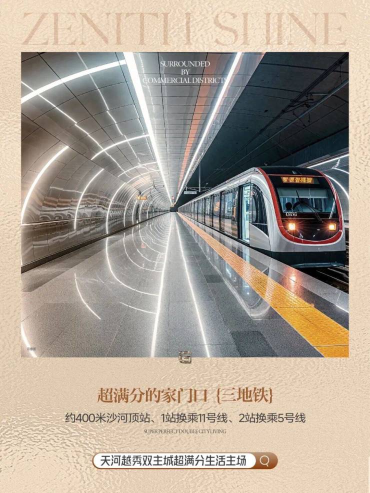 【超满分💯的家门口三地铁】周边交通路网丰富,紧握城市动脉,约400米沙河顶站,1站换乘11号线,2站换乘5号线,离广州东站直线距离仅3公里,立体交通路网,畅达全城。出发与归家,不过一顿饭的时间!
