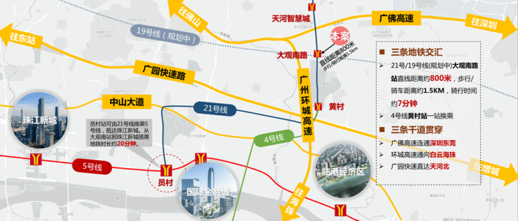 地铁——21号线大观南站,3站科学城,5站到5号线可转乘2站到珠江新城;4号线黄村站,2站到车陂南,4站到珠江新城;19号线(规划中),全长34.2km,覆盖衔接广佛。