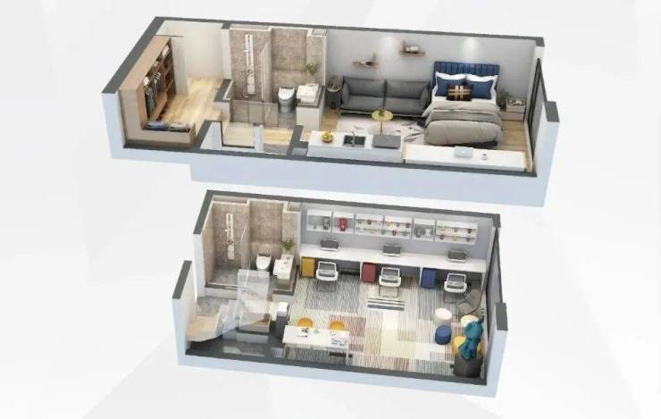 户型:33-58㎡,4.5米层高的 LOFT一房一厅户型,可实现一层办公一层居住。
