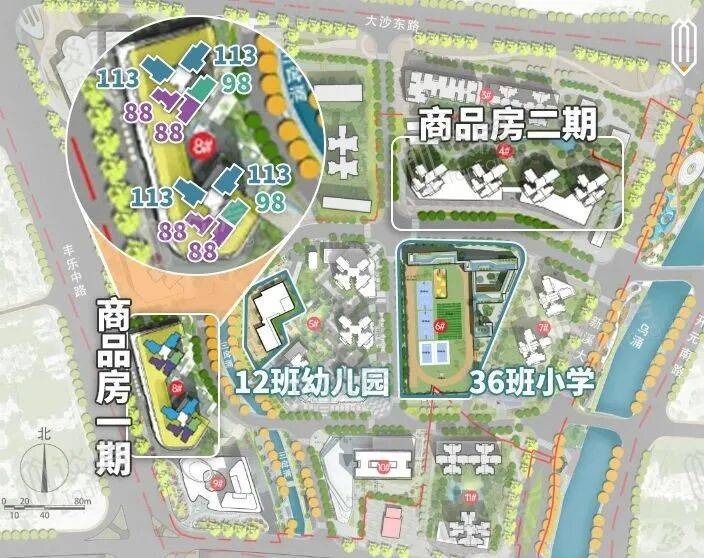 自身配建一所12班幼儿园,一所36班小学,初中依靠周边现有配套。
