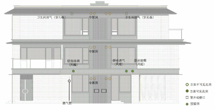 如何处理燃气管、排气口、冷媒洞与检修口这些功能构件,是立面设计无法回避的现实课题。通过现代转译元素挑檐、腔体腰线等,对其进行整体性收纳,是建筑完成度的深层体现。
