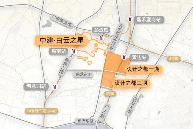 距黄边站约800m,3站白云新城,直达江南西,广州南。14号线二期约300米、鹤南(建设中)直线距离约800米,直达火车站。