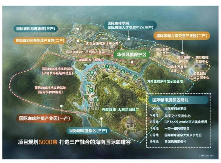 正大·太阳河咖啡小镇是由世界500强正大集团携手万宁市政府共同打造的以兴隆咖啡为基础、咖啡产业为核心、华侨情怀为动力、复兴民族咖啡为使命的中国咖啡三产融合标杆典范。项目建设约5000亩国际全产业咖啡谷,构建七大片区三产融合全产业链,规划“一产种植、二产加工生产、三产研发教育+会议会展+交易金融+仓储物流+文化节庆”。