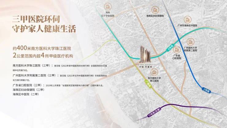 500米步行南方医科大学珠江医院,广州医科大学附属第二医院、广州市红十字会医院、广东省口腔医院等多家三甲医院保驾护航。