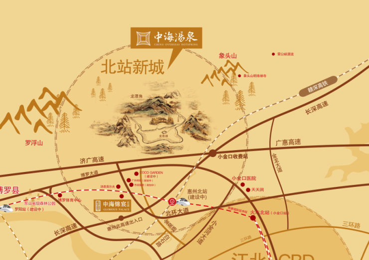 1、北站新城:汤泉项目位于惠城区高铁北站新城,距离惠州市政府、江北CBD约17公里,开车20分钟,各项生活及商业配套十分便利。