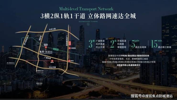 路网通达: 项目紧邻华观路、科韵路、大观路等多条城市主干道,经华南快速、环城高速,车行15分钟内可快速抵达珠江新城、金融城、琶洲三大核心商务区。