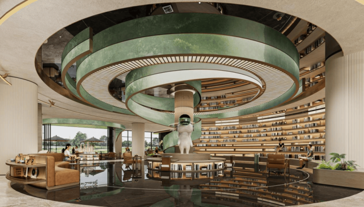 行云书院:湖畔会所内设挑空图书馆,橡木书架与皮质座椅还原文人雅趣。