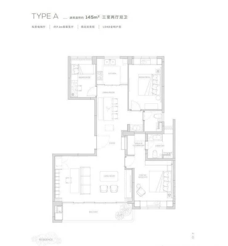 145产品为三房两厅两卫产品,餐厨一体化设计, 7米宽厅可切换各种生活场景,畅享宽幕般景观界面。