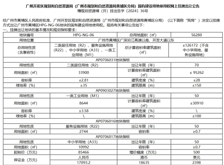 2024 年 12月2日,黄埔区广深沿江高速以南、开发大道以东HPG-NG-06地块,由中交城投、广州峻森投资以底价拿下,该地块起拍价8.5亿,总建面12.6万平。剔除3.09万平回迁+5149平配建,折合楼面价9482元/平。