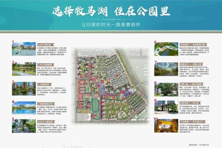 泰丰牧马湖位于惠州市大亚湾西区核心,紧邻深圳坪山,是泰丰集团斥资打造的百万方湖居教育大城。项目总占地面积约56万平方米,总建筑面积约133万平方米,容积率2.3,绿化率35%。项目最大的特色是保留了原生天然湖泊,拥有约3.4万平方米的湖景和2.5公里环湖岸线,构建了“湖居+公园”的生态居住体系。