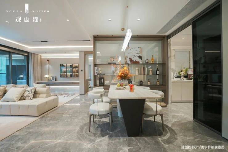 餐客厅超7米的嵌入式空间,能“隐形”玄关柜、电视柜、收纳柜等,带来巨大收纳空间,也更显平整洁净。