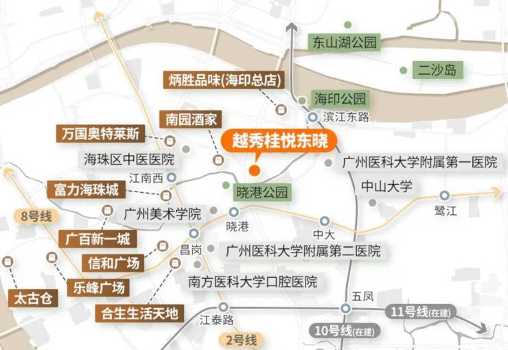 1,桂悦东晓位于海珠区的核心地段,靠近晓港公园和晓港地铁站,交通便利,周边周边有丰富的教育、商业和医疗配套,包括多所学校和医疗中心,满足居民的日常生活需求,居住氛围感和烟火气很浓