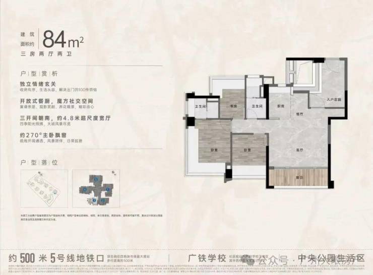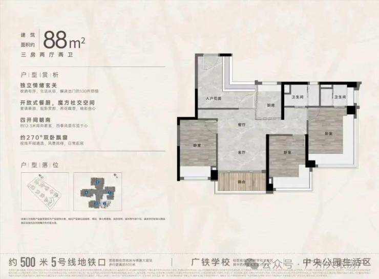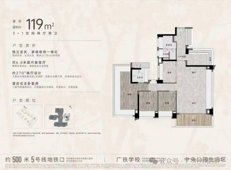 “中央公园”,紧邻大脚印公园,距离地铁约500米,紧邻学校、酒店
