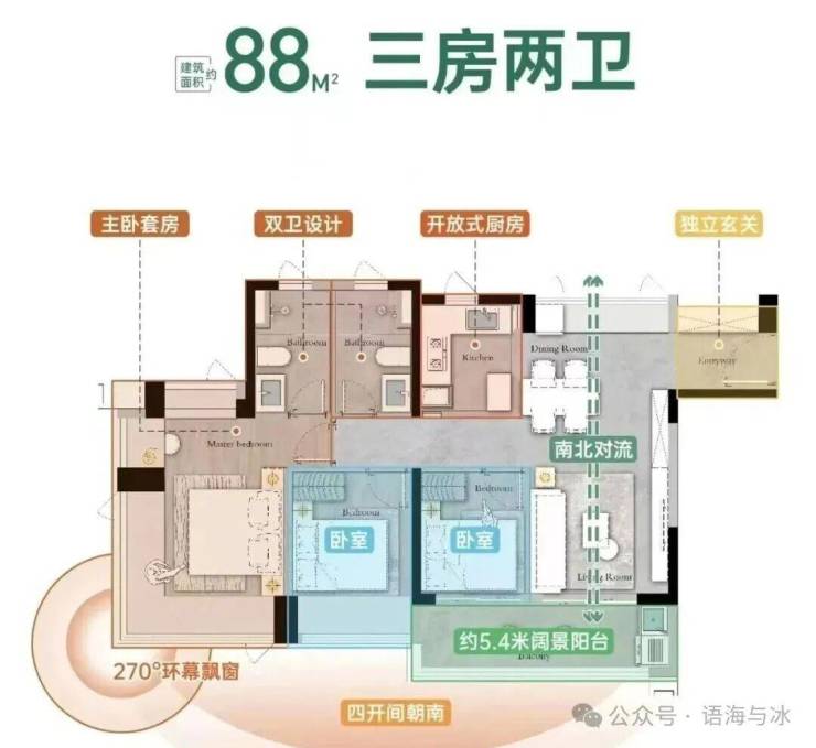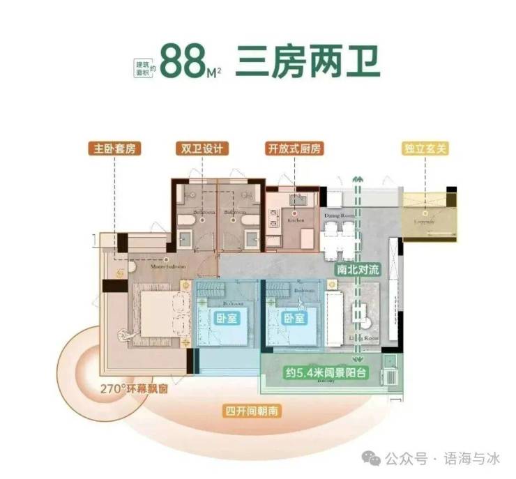 建面88平A2户型,三房两卫,三个卧室加阳台都是南向
