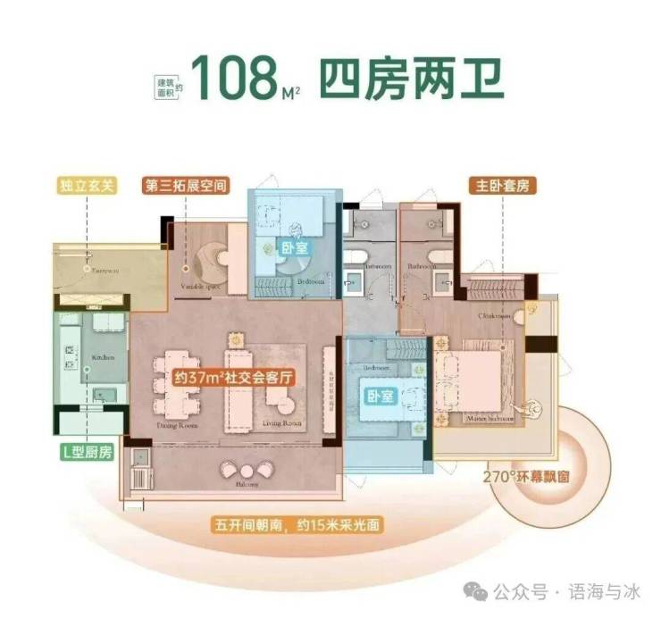 建面108平户型,是项目最大的户型,五开间朝南,客厅开间6.3米,整个南向采光面去到了12.9米,如果不需要那么多房间的话,还可以考虑保留北向的阳台,让南北对流更加通透