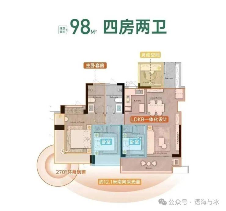 而且,它的主卧还配置了270°环幕飘窗,带来了最大化的采光面及观景视野。