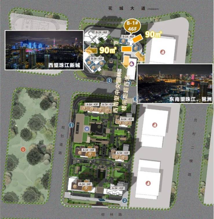 项目分南北地块开发,北地块离地铁 5 号线 / 11 号线员村站约 900 米(步行 15 分钟),南地块更靠近江边,不过目前周边被城中村和旧厂房环绕,员村旧改进度缓慢,城市界面有点杂乱,跟 “高大上” 的金融城规划相比,现阶段看着还挺 “接地气”。