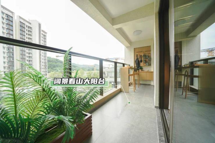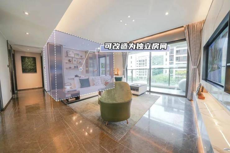 同样是动静分离的格局,不同的是它的阳台更显阔气,连通了客厅和客卧,形成超大开间,透过实景板房,已经能看到窗外的绵延山体。