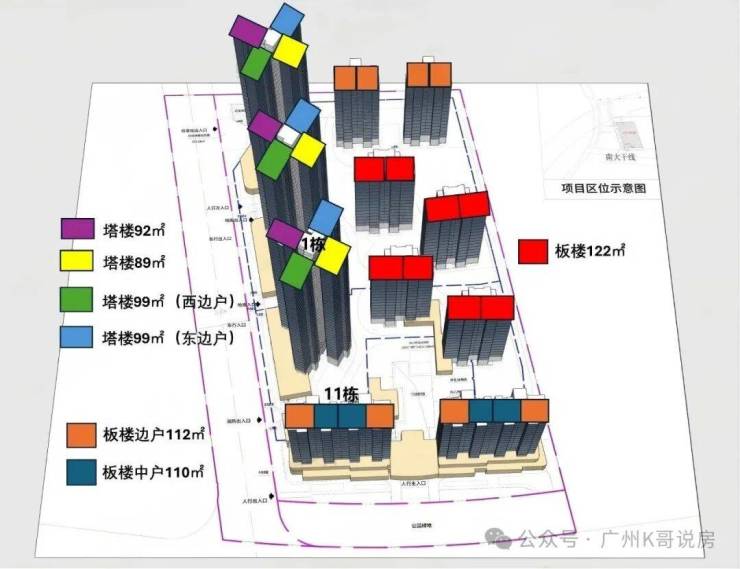 全盘一共规划有11栋住宅,其中塔楼3栋,板楼8栋,涵盖2T2板楼与2T4塔楼两种产品。
