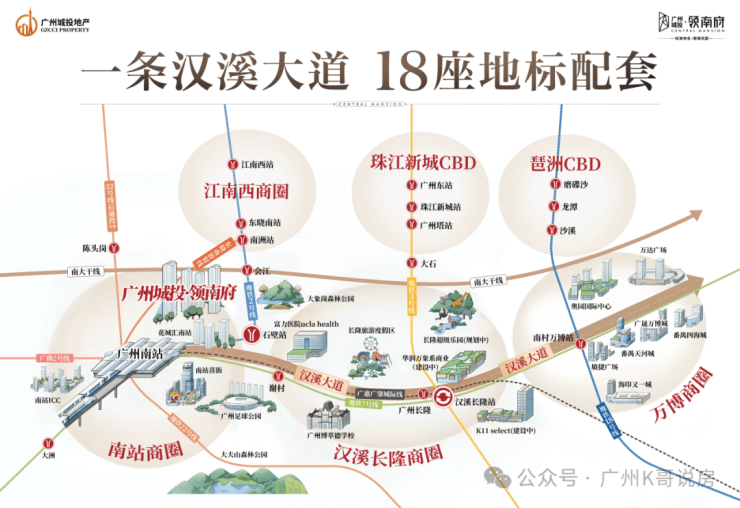 一条汉溪大道,串联南站商圈、江南西商圈、汉溪长隆商圈、珠江新城CBD、琶洲CBD和万博商圈,城市繁华便捷可享。