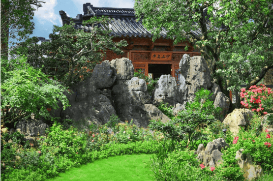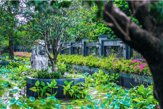 2)大型亲水荷塘 以水为核心,以约 200 多棵高大乔木、约 29 组富贵绿石及英石为主要景观,大量荷花等水生植物作为衬托,园林和建筑融合得美轮美奂
