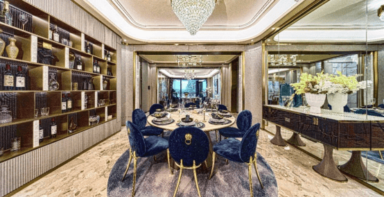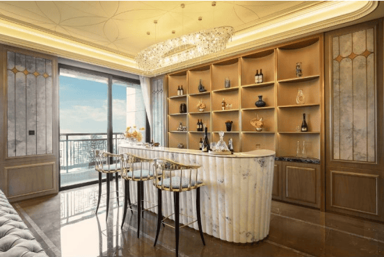 【超极休闲厅】270°外飘超极观景台,收纳志趣的雅集 十公里江城园无遮无挡一览无遗,大湾区唯此盛景; 超极水吧空间,背景柜设计成私人收藏展示区; 天空之境奢石吧台,配备全套控温酒柜;