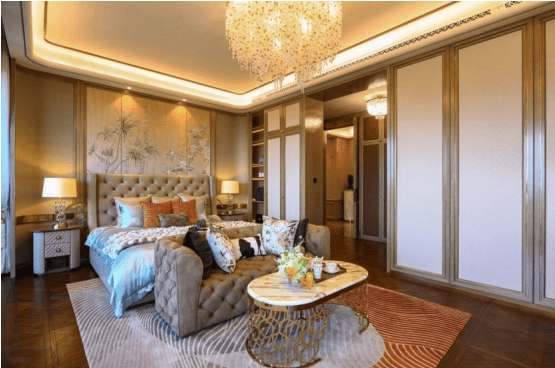 【奢享艺术与气质的星级主套】——全球顶级奢侈品材质视觉盛宴 主卧墙面采取淡雅扪皮和香槟金色拉丝不锈钢饰线元素设计;