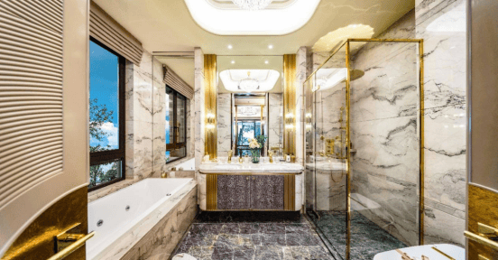 【世界级卫生间】为舒适高定 主背景墙设计前卫,采用大理石马赛克材质,搭配不规则的椭圆形清镜,时尚轻盈;全球严选奢石:缅甸亚马逊蓝、意大利芬迪灰、意大利普拉达绿; 世界名牌享受:德国 VilleroyBoch 洗手盆;法国 THG 龙头;意大利 HAFRO 按摩浴缸;意大利 GLASS 淋浴间;日本 TOTO 座厕;美国GRAFF五金配件; 数量上罕有、产品形态上的终极、品质上极致、空间上满足需求 不仅是家族成员休养生息的居所,还是家族传承的百年作品