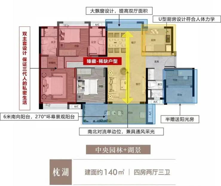 【140㎡四房二厅二卫】四房双主套,6米大阳台,望湖极致景观面!!