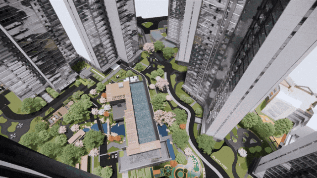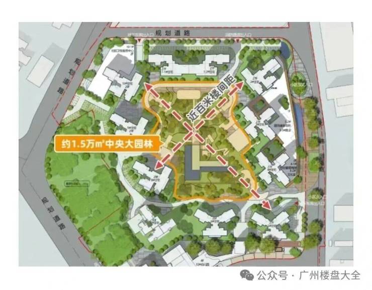 5、产品:整个采用围合式布局,拥有近百米楼间距,把充足的空间,留给园林、绿地,打造一座城市中轴之上,罕见的建面约1.5万㎡中央大园林。