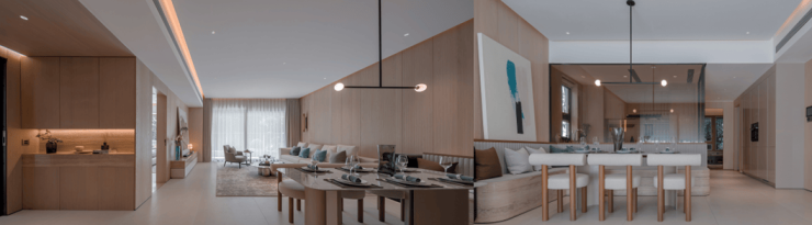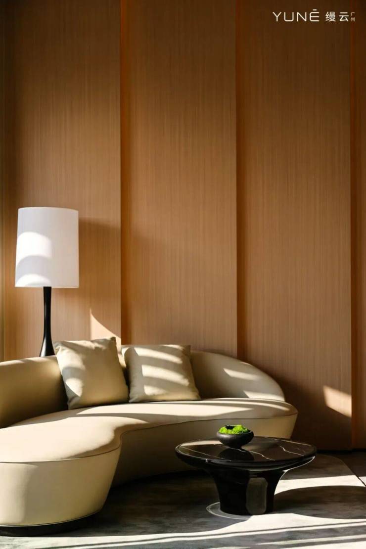 从步入楼栋大堂的那一刻起,原木的表达成为了空间的主旋律。光影之下,历经100多次打样选定的“小山纹”橡木,配合5.3-7.2m全景横厅视野,营造出简洁而舒缓的氛围,如同业主在感谢卡写的,“今天的交楼,交标是让我惊讶的,在这里居住像是度假一样”。