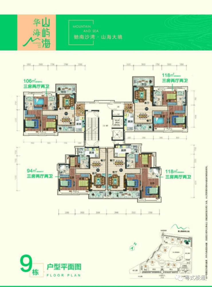 2 户型:94方三房两厅两卫,106方三房两厅两卫,118方三房两厅两卫