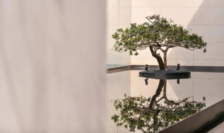 如同售楼部外定制高端水景,让地面植被与天光云影投景入水,打造IMAX级宽幕水景,景观视野体现得淋漓尽致。