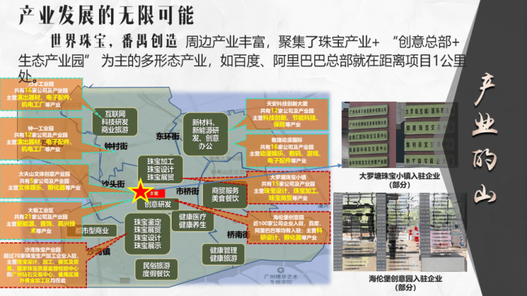 周边产业丰富,聚集了珠宝产业+“创意总部+生态产业园”为主的多形态产业,如百度、阿里巴巴总部就在距离项目1公里处,成为未来城市高阶生活地 。