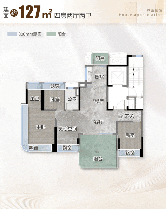 127㎡升,整个户型的设计,除了极致的私密,还带来了极致的通风采光。