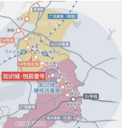 知识城悦辰壹号位于黄埔知识城板块的核心位置,地理位置得天独厚。在交通方面,虽然距离地铁 14 号线支线何棠下站约 2.2 公里,需要借助骑小电驴等方式接驳,但整体交通网络规划完善且极具潜力。地铁 14 号线知识城支线已开通,并可接驳 21 号线通达天河,未来还有 37 号线(规划中),进一步加强与天河、越秀等核心区的联系。