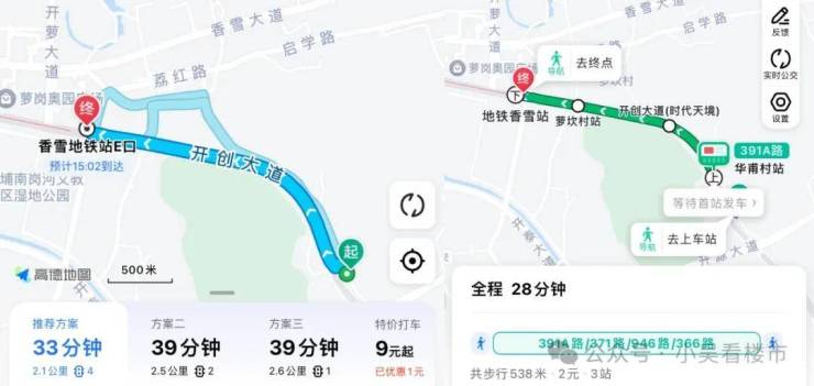 距离项目最近的地铁是香雪站,乘坐6号线,4个站可达天河,不过小区距离地铁站距离,步行得2.1公里,要走半小时左右,只能通过小电驴接驳了,不愿意走路或者小电驴的话,可以通过公交接驳地铁,大概也是半小时左右的车程。