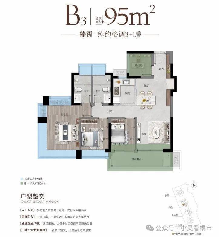 建面95平三房,3+1灵动空间,入户处可改间书房,L型厨房,跟85很像,算是扩大版,总价250万起。