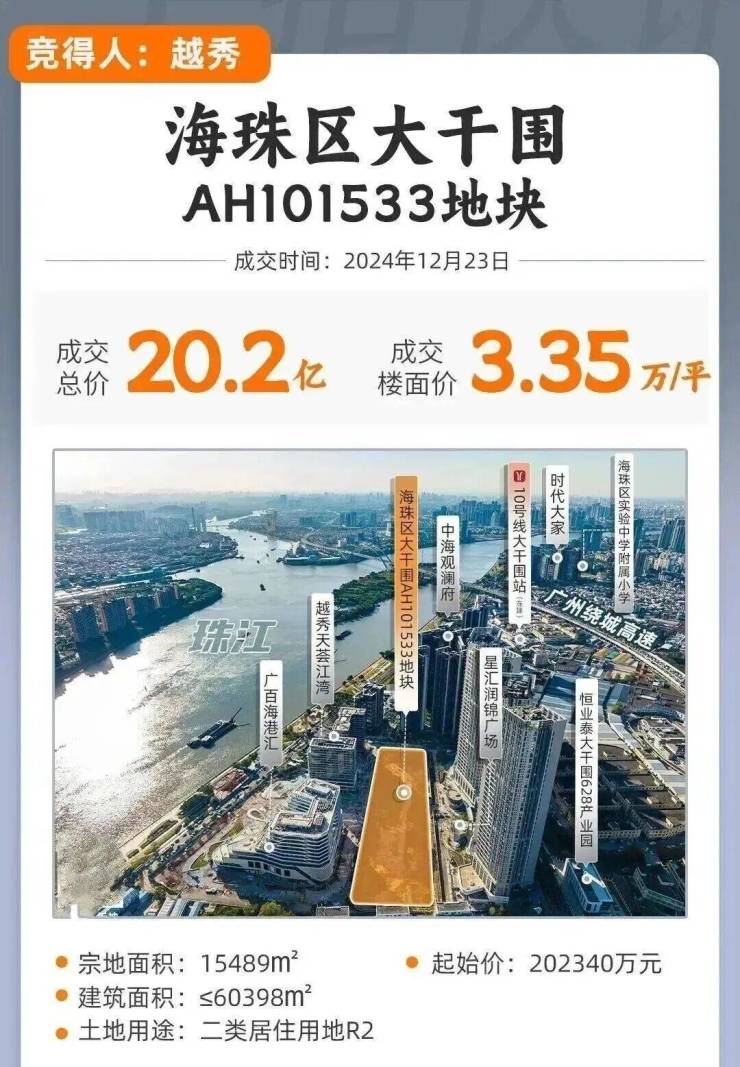 海珠大干围AH101533地块,2024年12月23号越秀地产竞得,建面6万方+,总价超20亿,折合楼面价33501元/平。