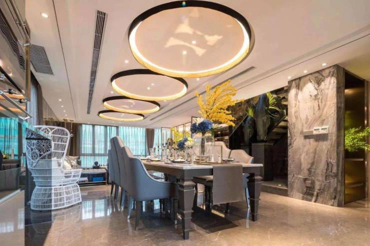 整个空间,磅礴大气,首层高约3.3米,客厅挑空约6.4米,地下空间挑空约6-7米,以2倍于平层的高度,匹配高层次的居住生活。