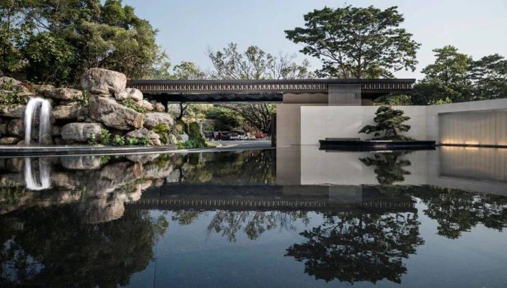 一进府门,门楼、水景、迎客松,庄严而不失意境。从远处望去,具有强烈的辨识度,给人一种“到家了”的心里暗示。