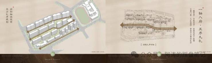 ①【板式楼栋】2.93低密府院大宅,一字板式楼栋布局,户户朝南,风光俱佳。一轴入府,以礼制中轴对称规制院落布局,尽显府院的东方美学