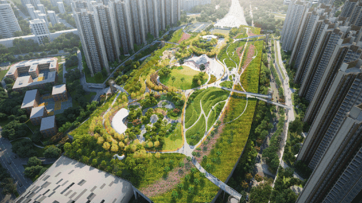 项目配套占地约15万㎡公园,从小区一期出来,有连廊直通公园入口,业主刷卡可以进入。非业主也可以坐电梯上去。