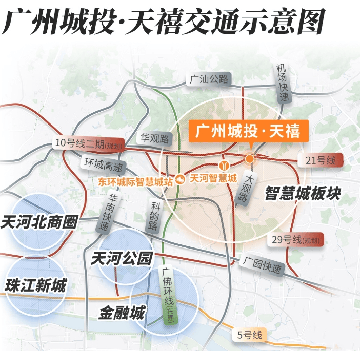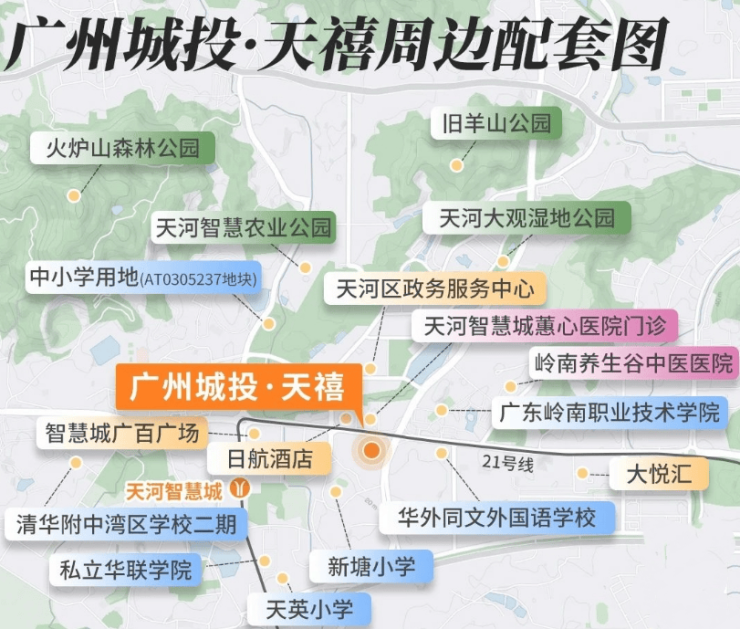 地铁方面,项目距离地铁21号线天河智慧城站直线距离800米,实际步行约1.4公里,需步行20分钟或骑行7分钟。该站为地铁快线,可3站到天河公园、6站到金融城、8站珠江新城,通勤效率较高。