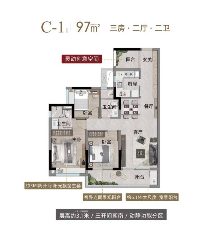 约3.1米层高,约6.1-9.4米宽景阳台,采光通风极佳